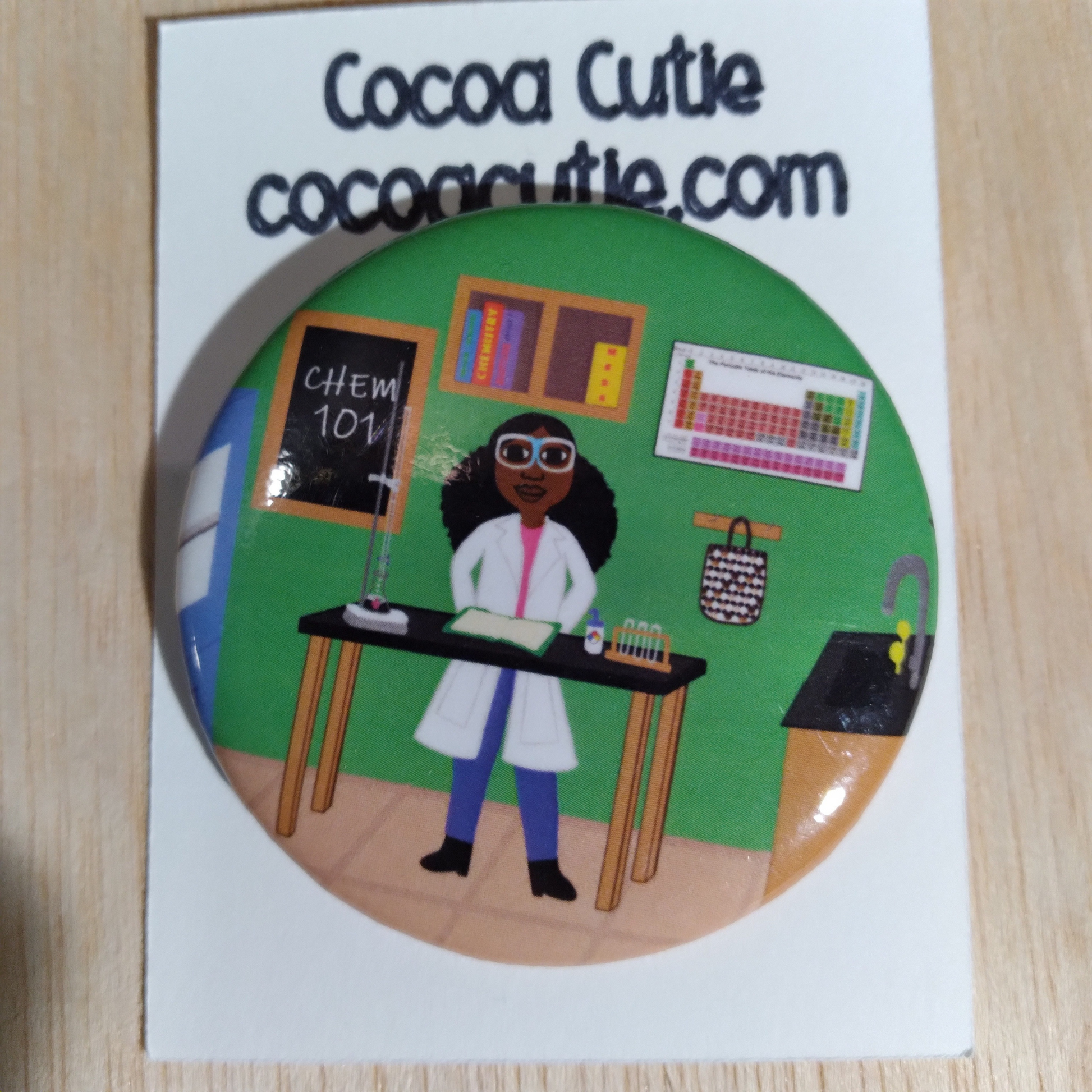 This Cocoa Cutie Chemist Girl Button is an essential accessory for any chemist-in-training. Ready to tackle any lab project, this cutie will add a little extra flavor to any outfit. Don't be beaker-ful - add this button to your collection today!